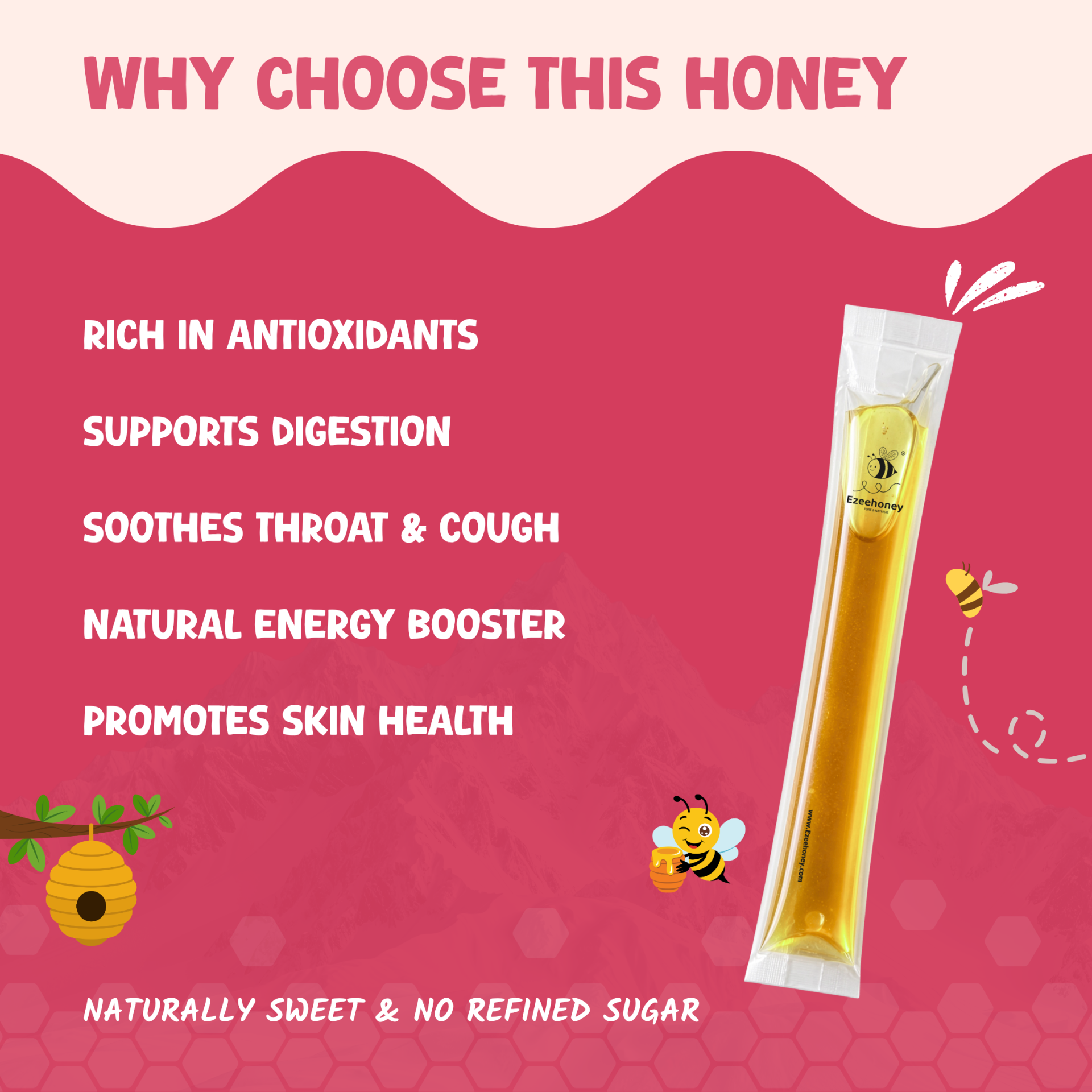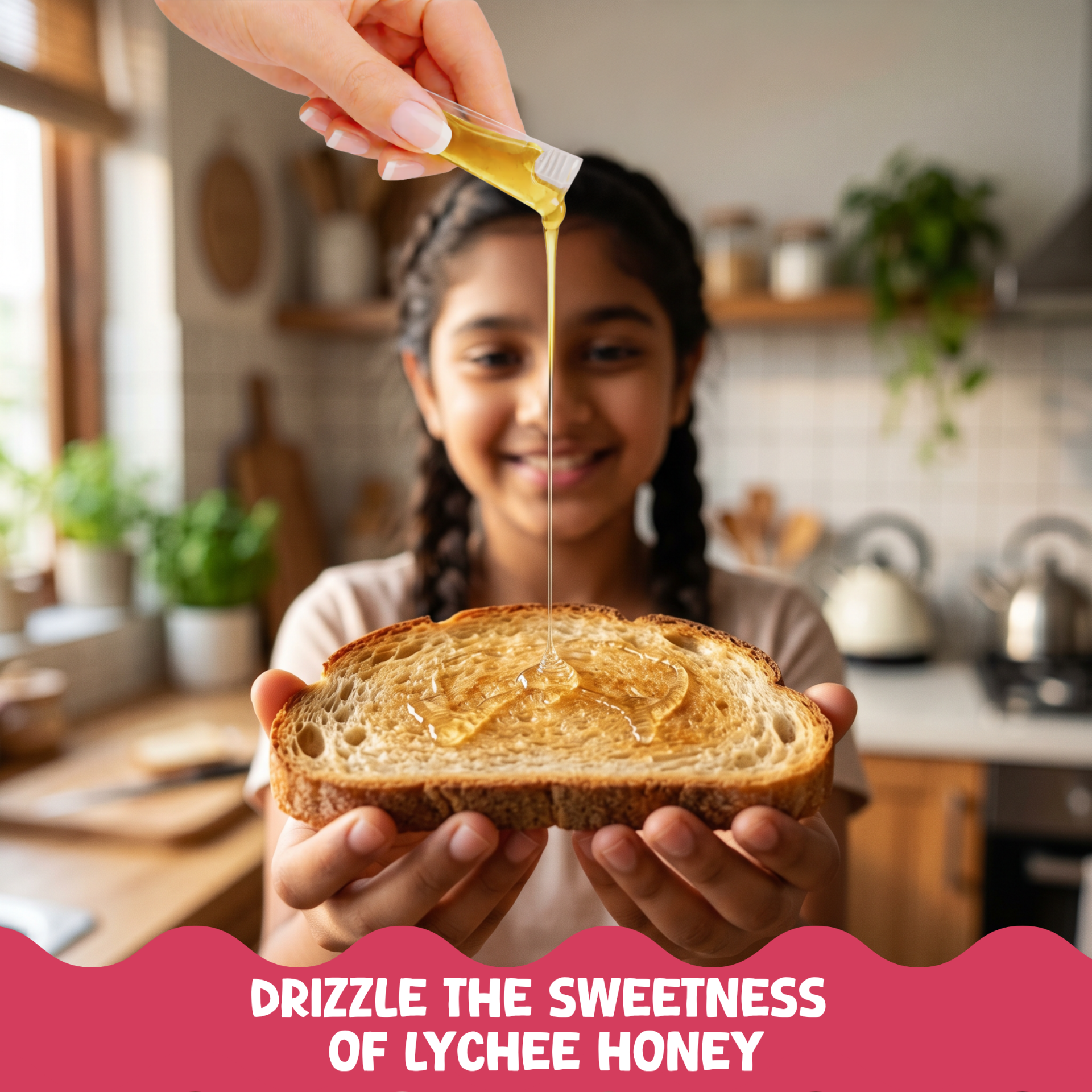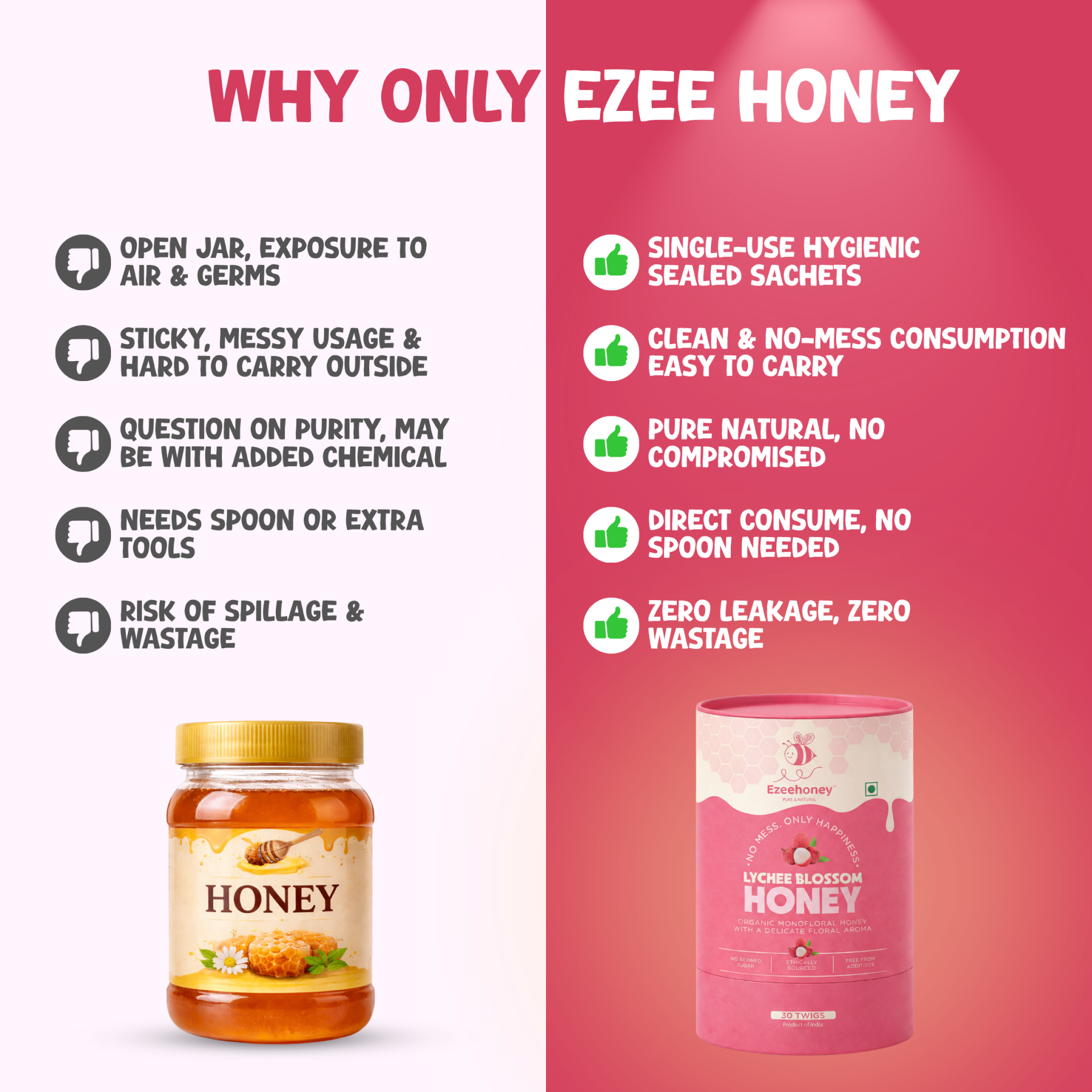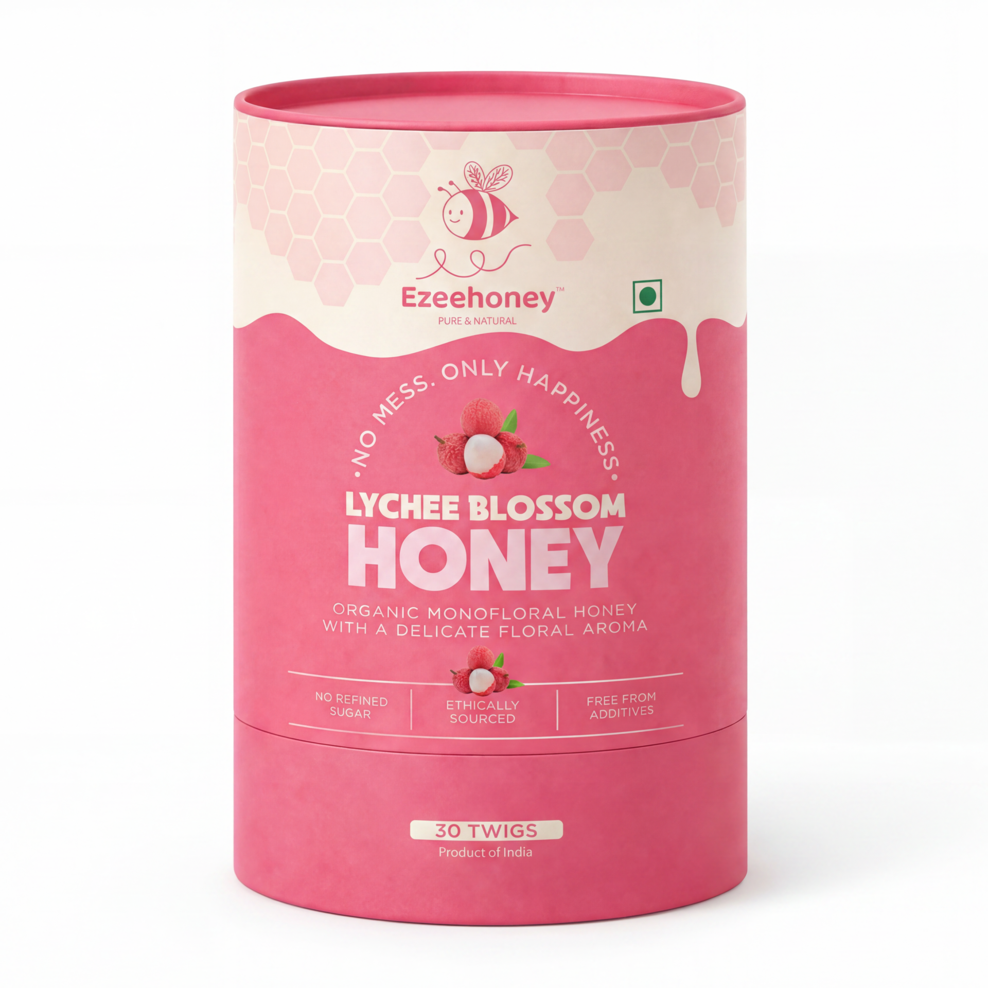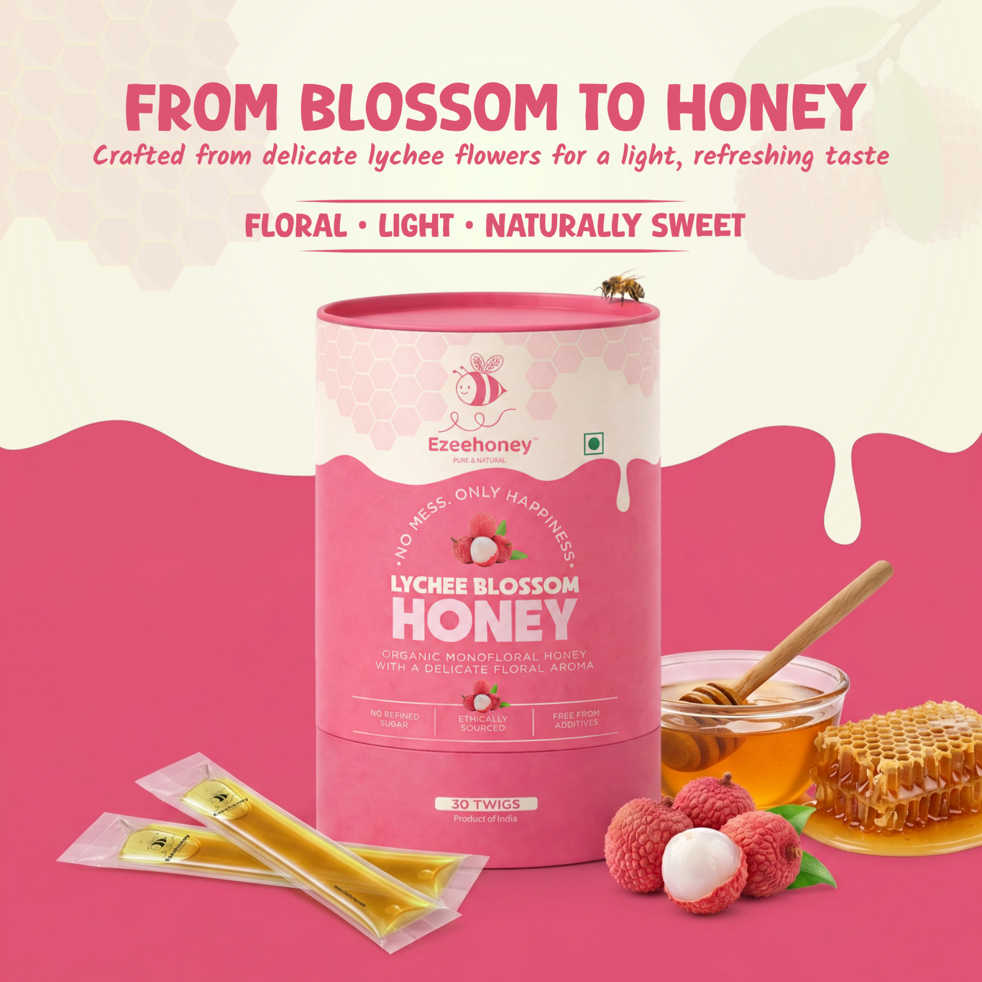 Indulge in the delicate sweetness of Ezeehoney™ Lychee Blossom Honey, a premium organic monofloral honey known for its light texture and floral aroma. Sourced ethically and packed in convenient sticks, it brings pure, mess-free happiness to your everyday moments.